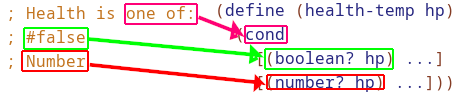 Notice how the Data Definition maps to the code. It’s a one of, so we need a cond with two matching cases. In the 2nd case, we simplify what would be (cons? lst) to else instead for short. Always use the derived template as starter code, as all recursive functions will have this structure.